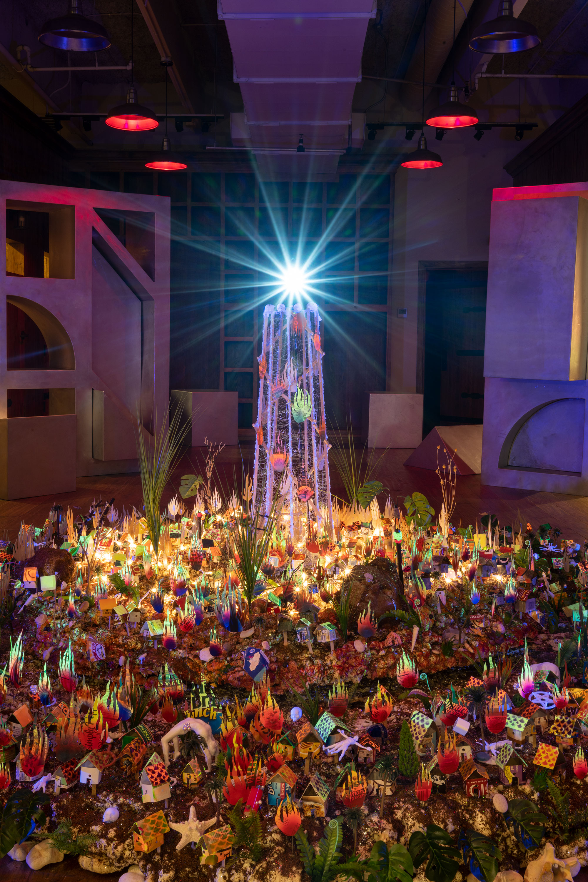 Transformation is also a central theme in Tiered Panorama which expands on Estrada’s ongoing series of mystical, mixed media landscapes. Using practical construction methods, ingeniously upcycled consumer waste, and 3D printing technology - cereal boxes, broken cell phones, artificial pearls, various forms of plastic and many other unconventional art materials become power objects; elevating craft to the realm of the sacred. This artwork is a shrine for contemporary ecosystems, highlighting plastics as ubiquitous, if not foundational, to the modern era. Estrada’s sculptural work takes origin from his grandmother’s expansive collection of ornamental Christmas villages as well as the Puerto Rican craft of Casitas. Casitas are typically miniature ceramic facades of traditional island homes, and this idea transforms into a nuanced and compelling statement through Estrada’s visionary lens. His animated and cinematic artwork functions as an omen; warning of a dystopian world of runaway emissions and pollution. Appearing as a demented architectural model of an imagined Miami of the future, the artwork is a mirage of a city featuring idyllic vignettes, hellish apparitions, and a central, phantom lighthouse in perpetual rotation.